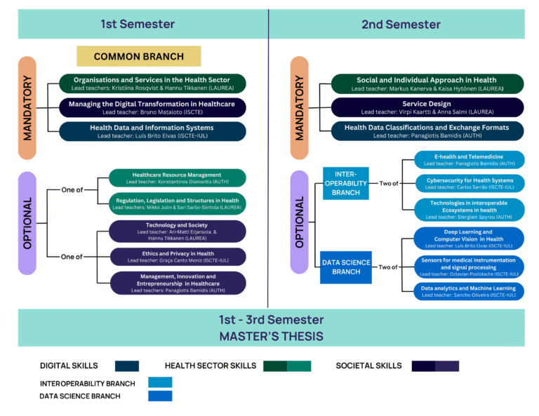 The Master’s programme has 3 main components: 1. Health sector skills; 2. Societal skills; and 3. Digital skills.